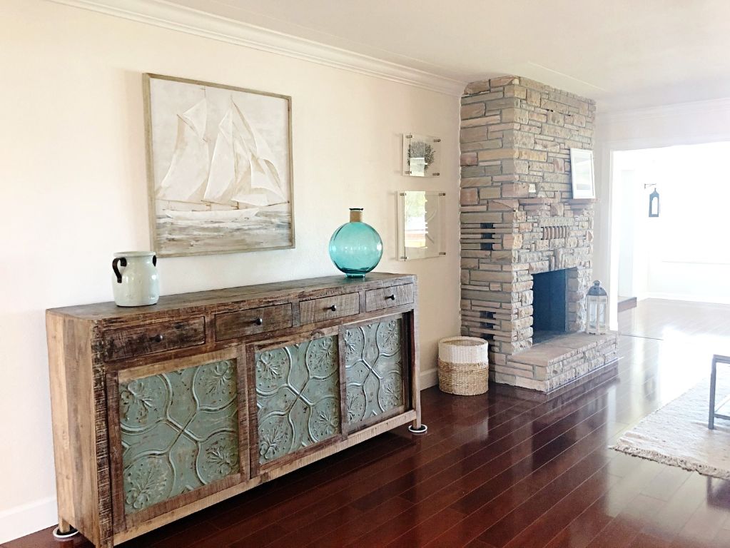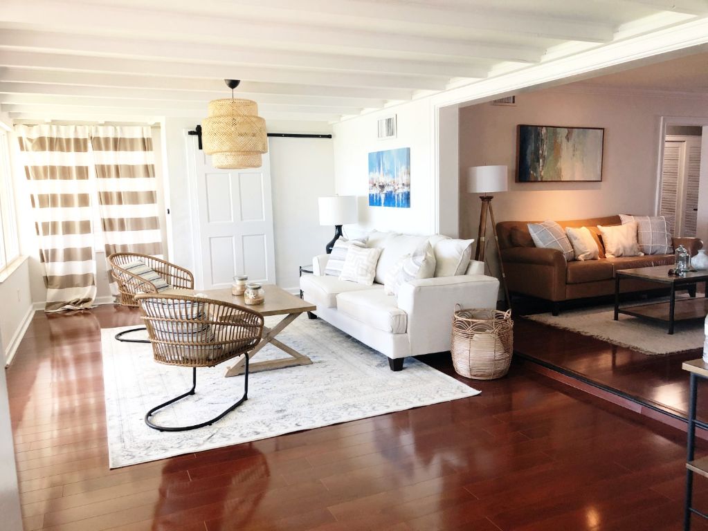 I've added a console and a light rug in the hallway, some decor on the fireplace to hide electrical plugs from the 70"s, a large wooden coffee table gave a beach vibe on an oatmeal wool rug. In the bedrooms, I've changed furniture locations and added linen and pillows, some nightstand lamps. I hang some sea boat arts on walls and decorated the whole house in a coastal style and voila!