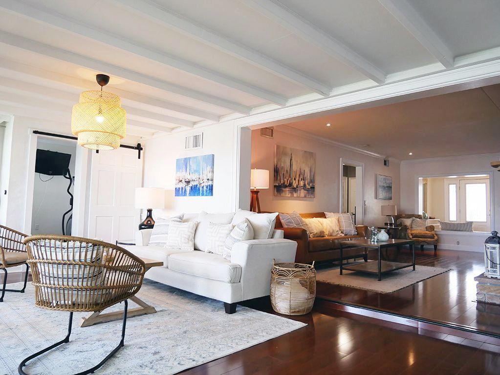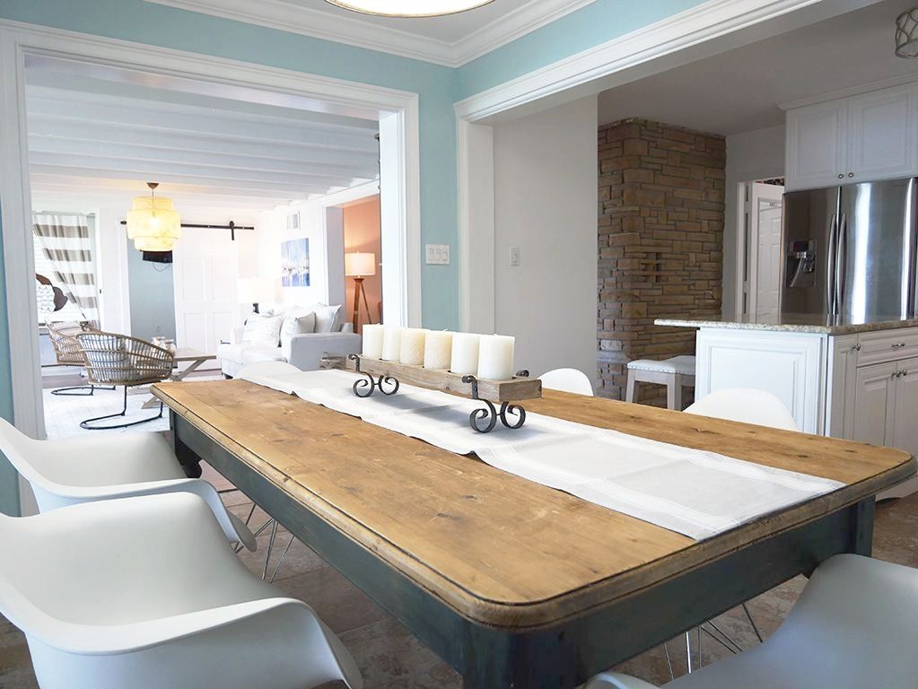 The challenge was to find a focus point to lead to the waterfront view and find a good color contrast with the beautiful dark floors and make this home feels like a beach vacation home. I've changed the old chandelier for a large rattan pendant that gave the perspective of the outdoor, added a large white/gray rug in the living room with a white comfy sofa and modern chairs. In the dining room, I got rid of the high table and chairs for a large antique wooden table with modern Eames chairs and moved a huge sideboard near the entrance.